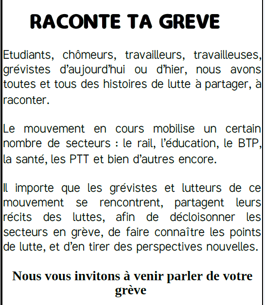 - A partir de 17h30 « Caisse de grève party », bâtiment Censive, chemin de la Censive du Tertre, arrêt Facultés ligne 2 – voir évènement indymedia ou facebook